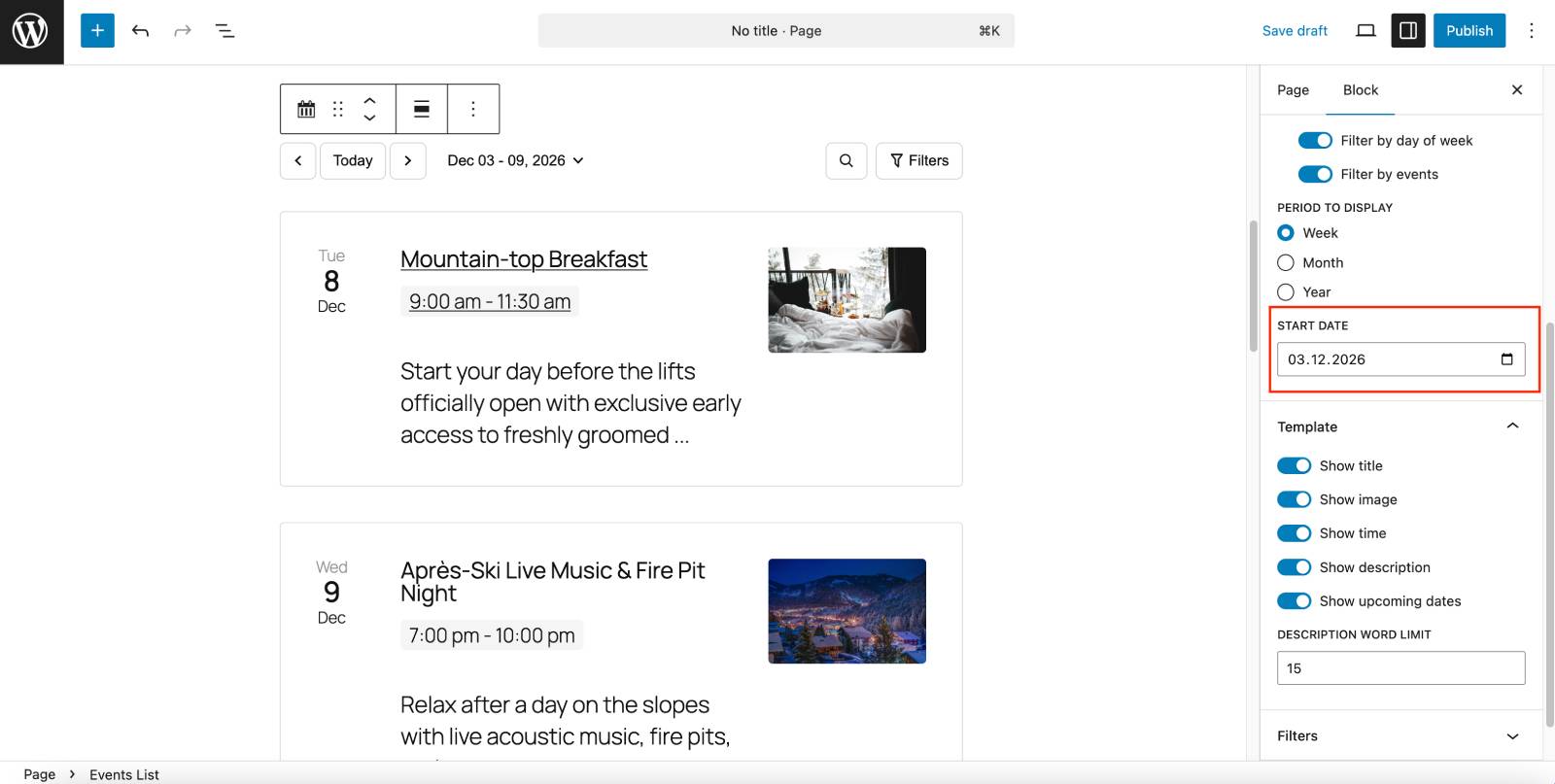 - Events Calendar block (your events in a calendar or list view).