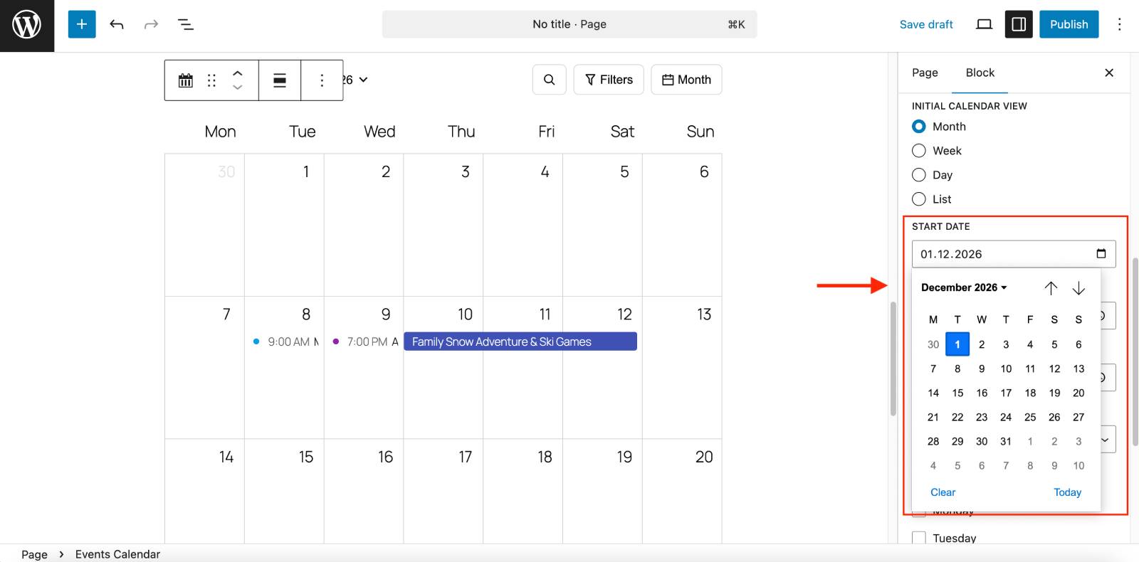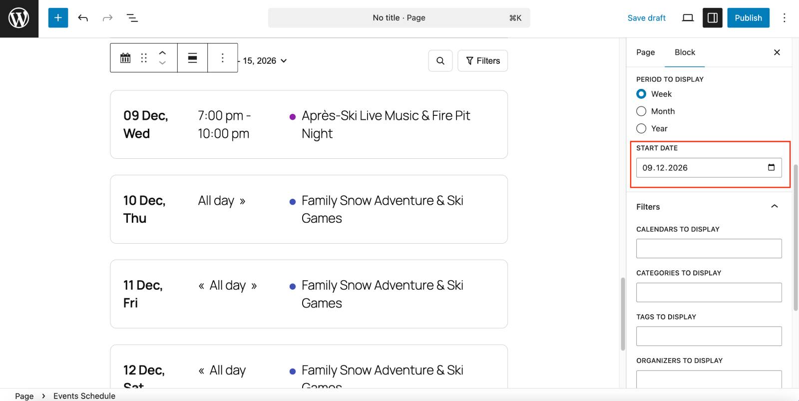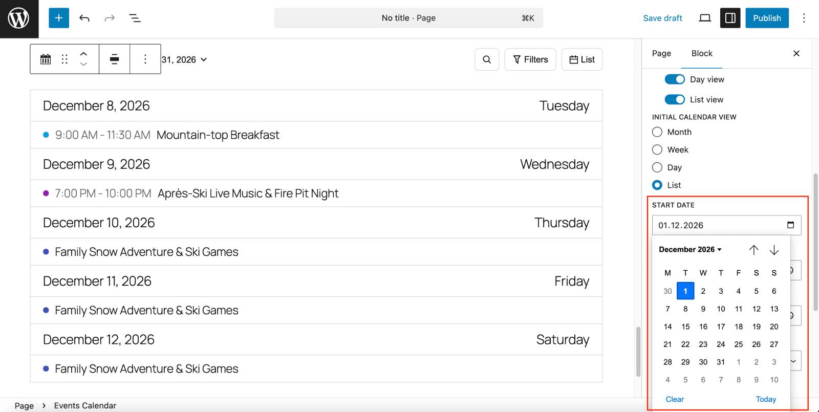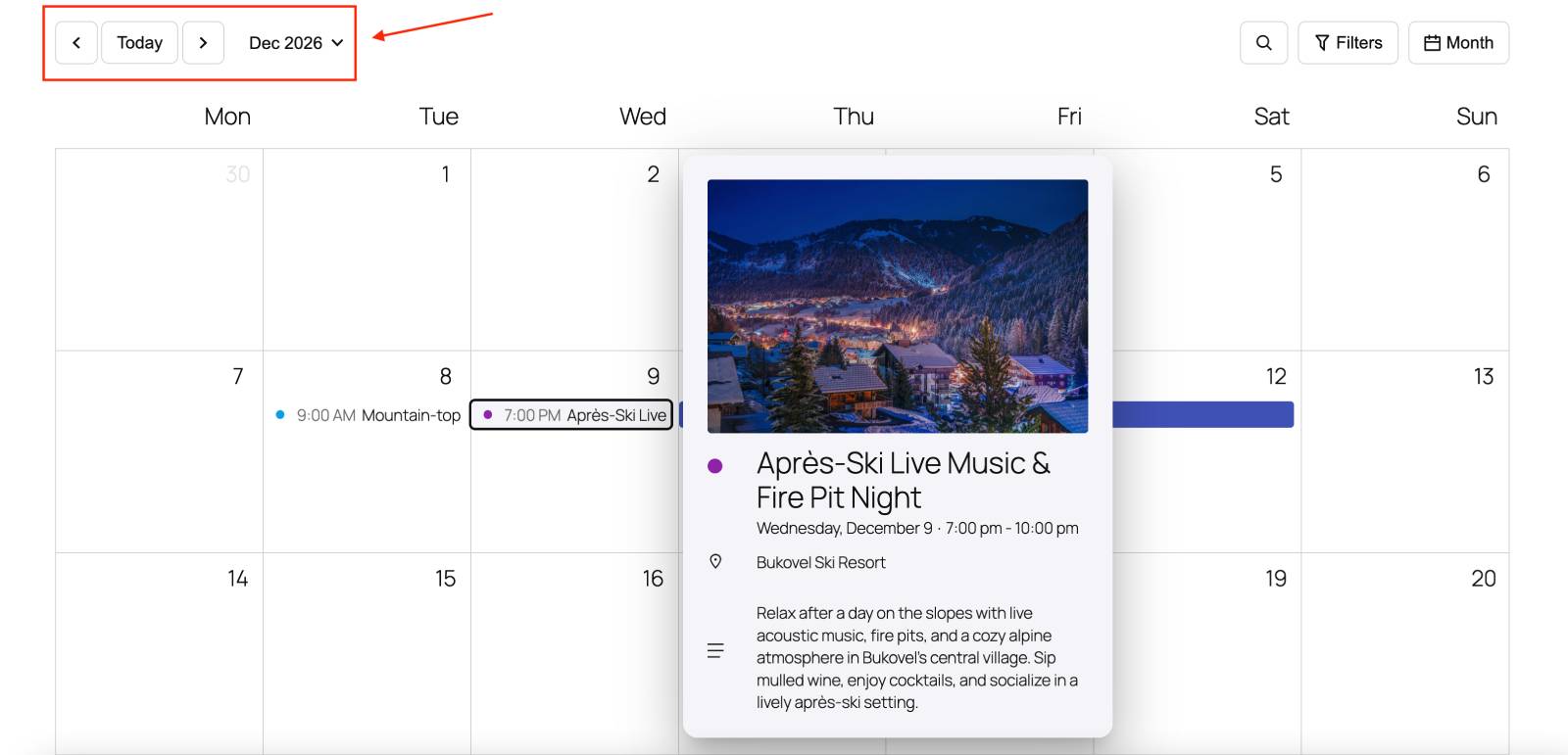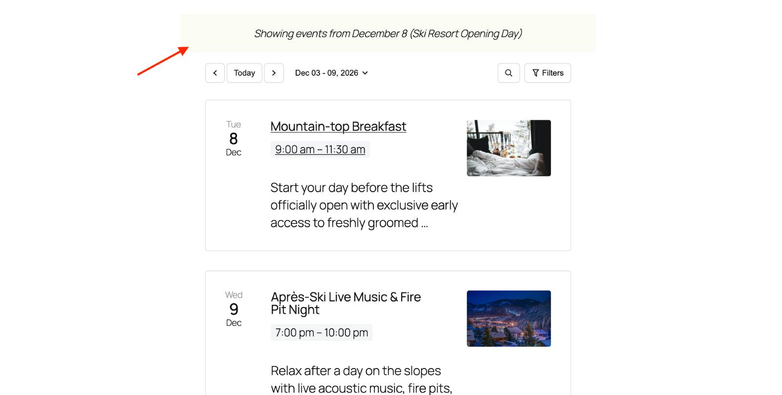 For example, I created a sample calendar that automatically shows ski resort events starting in December when visitors open the page. Even if they visit it in April – they see relative winter events right away!