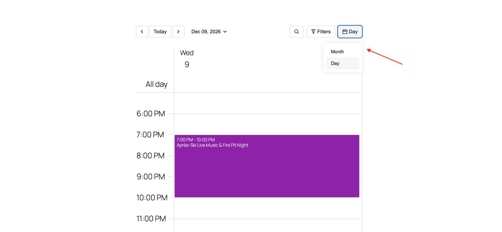 Moreover, simplifying the calendar view helps you optimize your actual schedule, finding the best angle for displaying events. If you don’t need all those view options, you can just remove them and show your events in the format that works best for your audience.