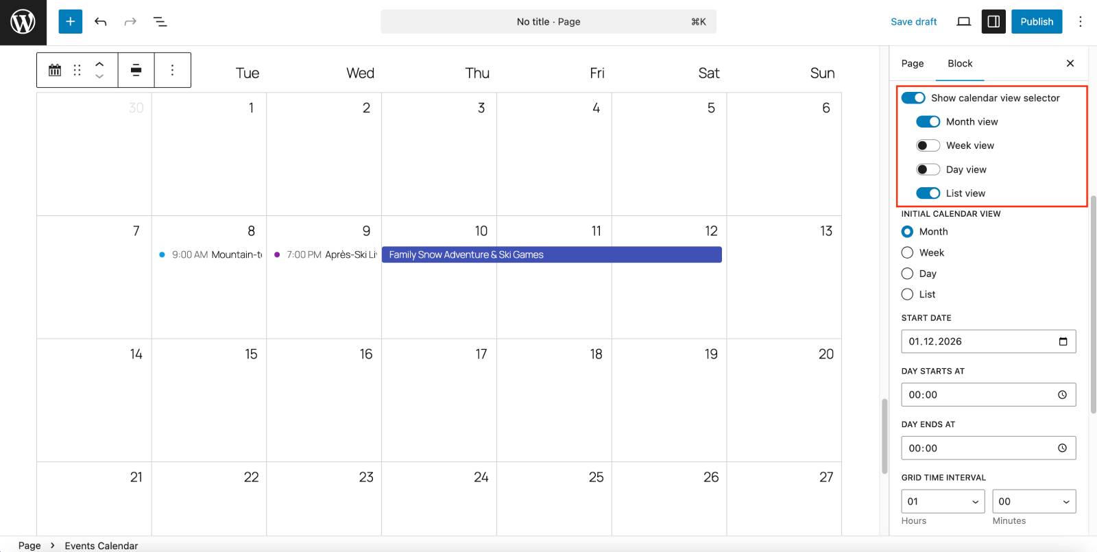 In this case, you basically choose the ‘initial calendar view’ in the block settings and then simply toggle off the ‘Show calendar view selector’. Optionally, of course, you may leave only the view modes you find suitable.