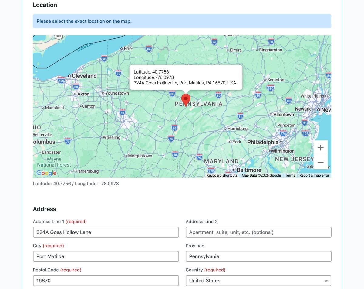 Important: Make sure to drag and drop the map pointer to the exact location of your property. This step ensures Google receives accurate geographic coordinates.