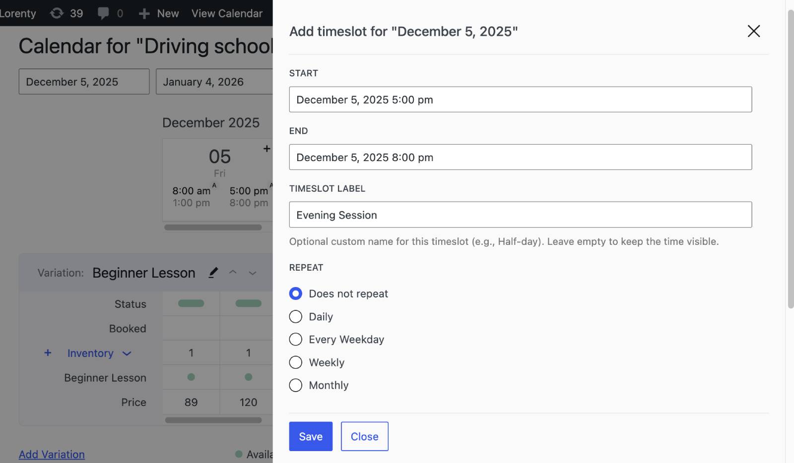 Time slots apply to all variations, but availability and pricing can differ per variation and date.