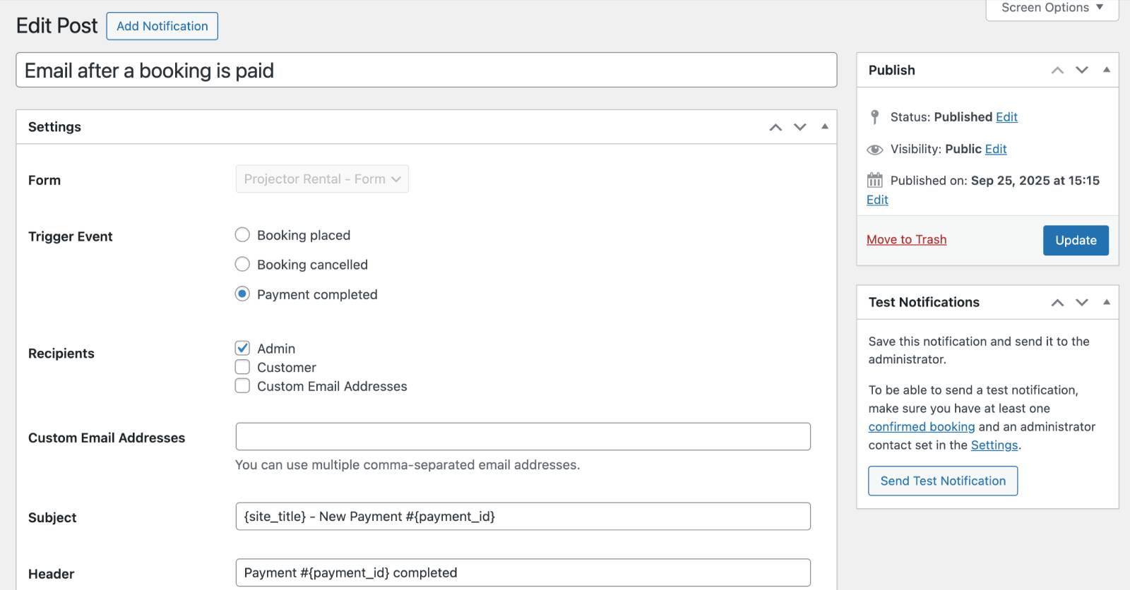 Note: For paid bookings, you can choose to send only the Payment Received email, or send both the Payment Received and New Booking emails simultaneously.